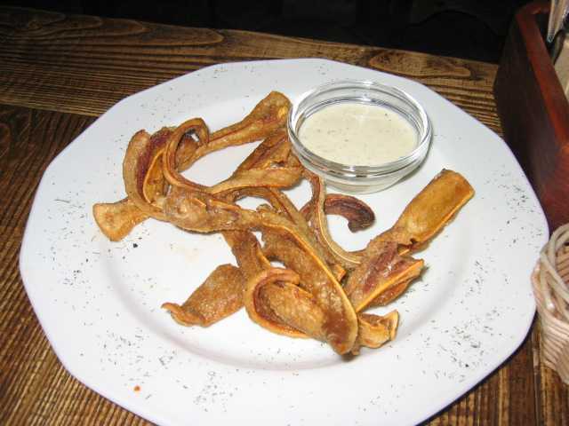 早速頼んでみた。値段は39クローン(346円)。期待したよりは量が多い。そしてニンニクとチーズのソースに付けると実に美味い。はっきり言って驚いた。高々豚肉。しかも耳。しかも元ロシアというすべての悪条件を裏切ってとても美味しいのだ。もちろん、ここで作っているビールも相当美味いのだが、このエストニアの揚げてあるミミガーには参ってしまった。