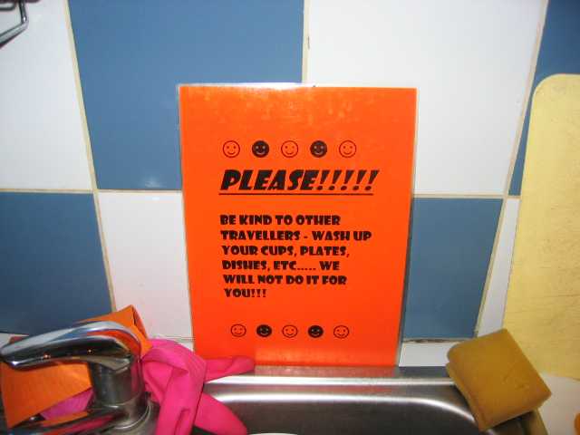 鍋が1つしかないので、私などは作った鍋の料理を更に移し、鍋を洗ってから食事を取るのに、一部の西洋人はそもそも洗いもしない。流しには、「使ったら自分で洗いましょね」と表示が出ているにもかかわらずだ。ひどい宿になると、「ここにはママがいないよの、自分で洗いましょうね」
