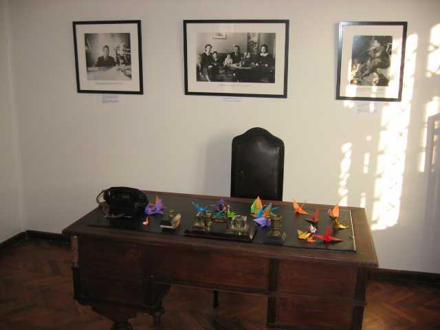 当時、杉原千畝がビザ発給に使っていた机が置かれており、ペンも残っていた。平和の使者として折鶴も置かれている。