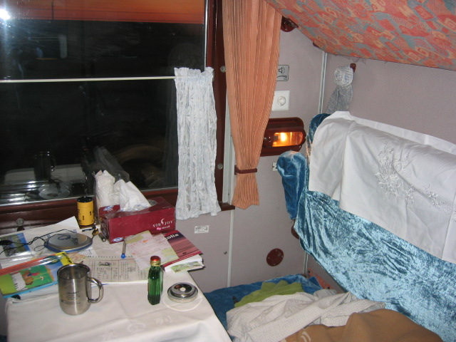 コンパートメント内はとても快適だった。ベッドは左右にあり、中央には小さなテーブルがある。窓は大きく、上半分は開くようになっている。上段のベッドは昼には斜めにすることでコンパートメントの空間を確保するようになっていた。ドアを閉めれば大き目の鏡が現れ、鍵も掛かる。下段のシートの下は荷物が格納できるようになっており、それぞれのベッドには小ランプが点灯する。とても機能的だ。