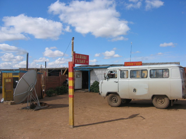 ゴビ砂漠への道は何通りかあるようだが、途中ごくたまに、そう3-4時間程度走るとお店や食堂がある。モンゴルの道の駅といったところだ。ただ食堂といっても掘っ建て小屋だったりゲルだったりである。我々はその1件で昼食を取ることにした。