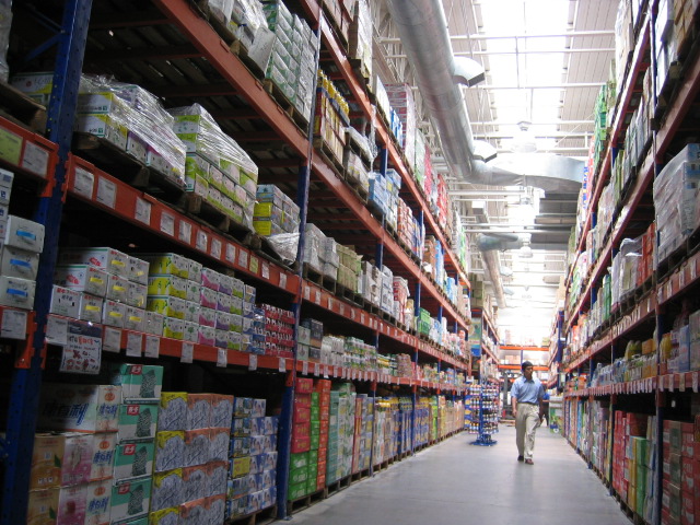 このスーパーはアメリカンタイプで、天井は高く棚も大きくて高い。手の届かない上の方の棚にはストックが置かれている。下の棚には商品がダンボールに入れられた置かれている。1つずつも売るが、ケース単位でも売っている。1フロアーのみで2階は無いが、その1フロアーが広い。
