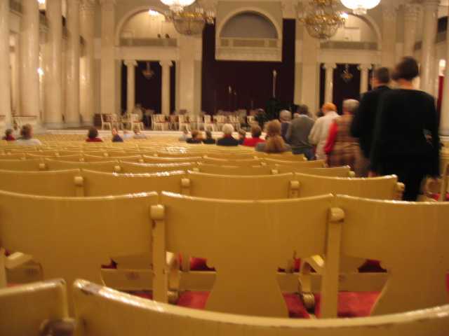 さて、いよいよ国立フィルハーモニーだ。何でもこの建物は1839年に建てられ、多くの名作が初演されたらしい。2階にあがると、作曲家達の肖像画が飾ってある。何だか小学校の音楽室みたいだ。観客達はまずここへ来て談笑し、シャンパンやワインを飲むのだった。