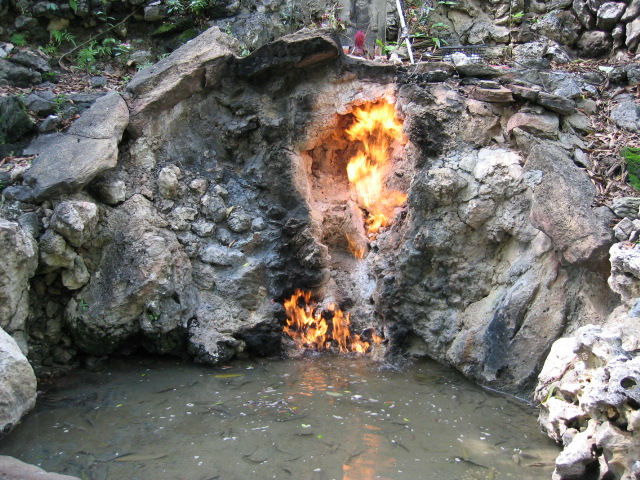 さて、実際に行ってみると確かに燃えていた。硫化水素も燃えるはずだが、においがしなかったので恐らく天然ガスだろう。小さい池の水面からボコボコと泡が出ている他、壁からも気体が出ているようで、1メートルくらいの火が常にゆらゆらと燃えていた。見ていると結構面白い。お湯はぐらぐら湧き出ているという感じではない様だ。池の水面は少し汚れている。温泉の成分らしい。