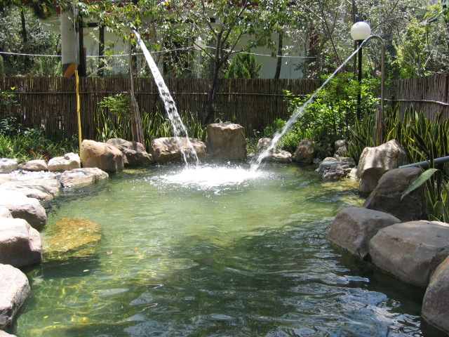 青い空。周囲の緑、白い湯気。何ともきれいな風景だ。大きな木によってできた日陰には24の大岩に囲まれた露天風呂である。2本の打たせ湯がある。この打たせ湯、台湾の温泉には良くあるようだ。日本の打たせ湯との違いは、お湯の自由落下ではなく、高い水圧をかけている。頭に当てると痛いくらいだ。