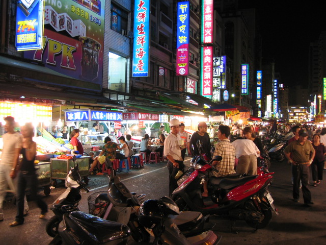 夜市にやってきた。500メートルくらいの道が歩行者天国となり―ただし自転車やバイクは入ってくるが―そこにあらゆる屋台が並ぶ。夜市は高雄の街にも何ヶ所かあって、ここの夜市は主に食べ物が中心ではあるが、中には射的みたいなものもある。